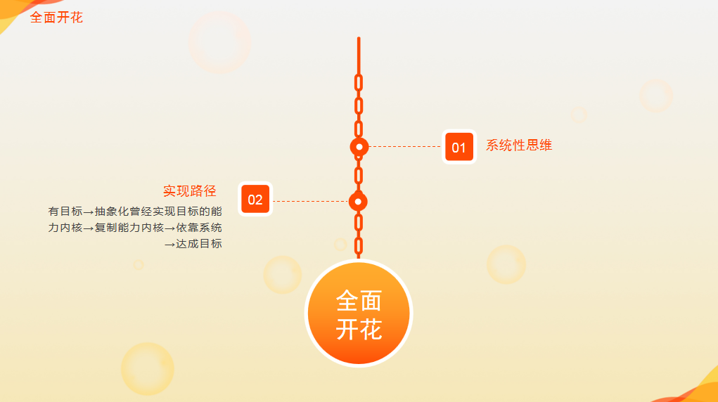全面开花,则更需要系统性思维。目标是多方面相互关系、发展变化的有机整体,“系统性思维”将人们对事物零散的认知联系为一个整体进行认知,使人们的认识更为完整、更具穿透力,极大地简化人们对事物的认知过程,使人们的思维更具全局意识和整体性。