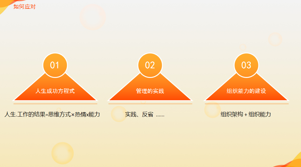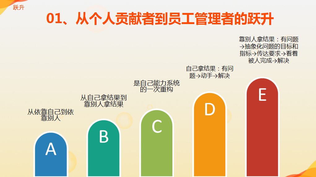 组织发展上的跃升,重点是:从个人贡献者到员工管理者的跃升。个人贡献者主要依靠自己拿结果,有问题时,自己动手解决。员工管理者是靠别人拿结果,有问题时,需要先抽象化问题的目标和指标,精准传达要求,看着任务被人完成,问题被人解决。这需要对自己的能力系统进行一次重要的重构。