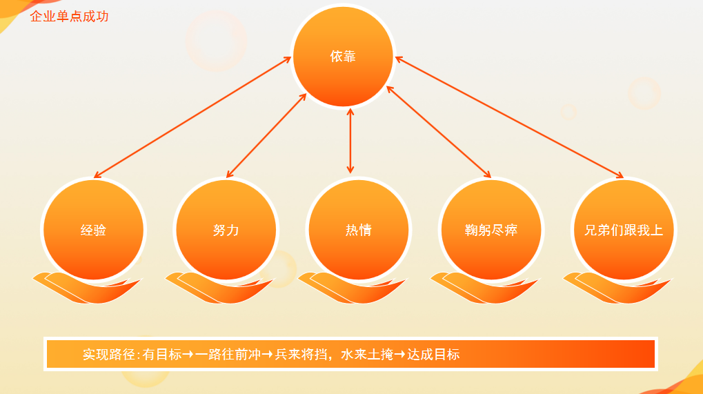 企业单点成功,依靠的是大家的经验、努力、热情。实现路径是有目标就一路往前冲,兵来将挡,水来土掩,领导鞠躬尽瘁,带领员工紧跟节奏,不达目标誓不罢休。