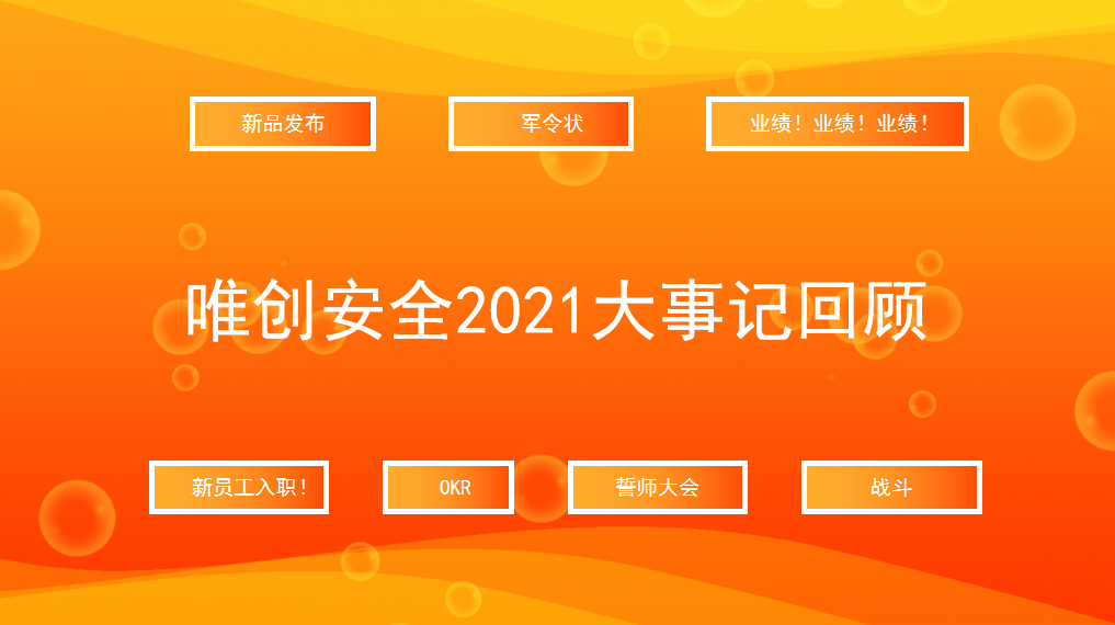 2021唯创安全大事记主要围绕:新品发布、军令状、业绩、新员工加入、OKR、誓师大会、战斗这些关键词展会,再次见证2021每一位唯创人的奋勇拼搏!