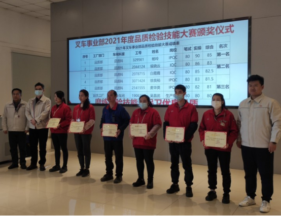 进一步激励各部门、各车间、各班组在安全/5S管理上的主动性和创造性,并全面落实叉车事业部各项安全/5S管理制度,鼓励先进。通过自主提报、资料审核、亮点展示,结合2021年度安全5S综合考核排名,总计提报36份先进集体/个人资料,经评审组综合核定,给予韶关工厂车身车间、翻新车间、工艺设备为2021年度安全先进集体单位,李海平、胡锦华、范宏孚、罗小红为2021年度安全先进个人奖,韶关工厂车身车间、仓务科、改装车间为2021年度5S先进集体单位,候国林、宋旱凤、钟海清、龚春凤、胡珍珠为2021年度5S先进个人奖,与此同时,还颁发2021年品质检验技能大赛前6名选手,王厂长、杨经理、周经理为荣获2021年安全环境5S先进集体/个人进行颁发奖状和证书,勉励大家在以后的工作中再接再厉,取得更好的成绩。