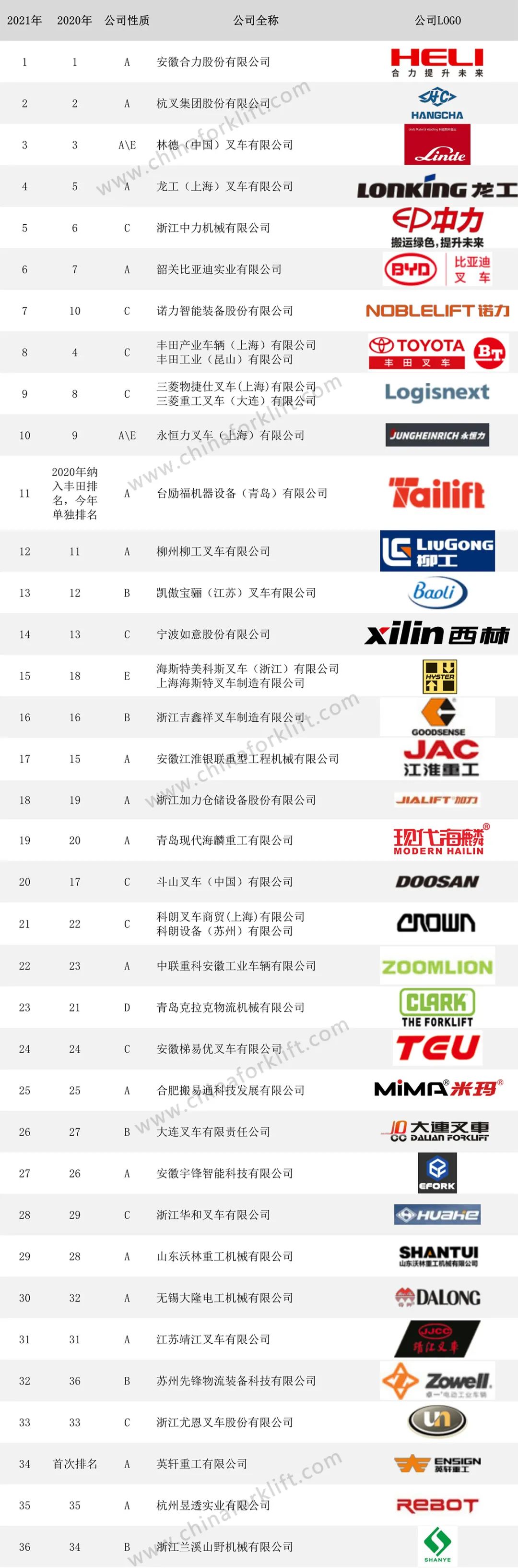 本次排名中,最低入围的企业年销售额不得低于1亿人民币,把以生产港口机械(包含集装箱叉车和堆高机)为主的三一、卡尔玛、科尼、特雷克斯、曼尼通等公司未纳入排名。三菱物捷仕叉车(上海)有限公司是包含三菱(MITSUBISHI)、力至优(NICHIYU)、TCM、欧克拉(ROCLA)四个品牌。台励福机器设备(青岛)有限公司在2020年是纳入丰田公司排名的,2021年单独排名,台励福的销售额包括青岛台励福及由青岛台励福出口台湾台励福的销售总额。海斯特美科斯叉车(浙江)有限公司在2020年是与海斯特分开排名的,2021年纳入海斯特一起排名。英轩重工有限公司首次参加排名。以上的调整会造成有的公司在今年的排名中有所变化。另还有企业因业务调整,已未排入今年的排名中,还有因销售额未能达到我网排行榜要求,或因其它原因,故未能纳入本次排名中。
