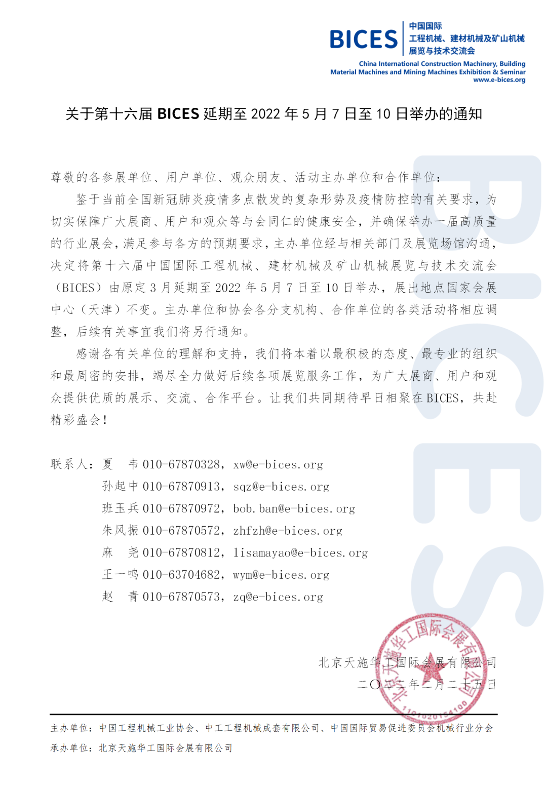 关于第十六届BICES延期至2022年5月7日至10日举办的通知