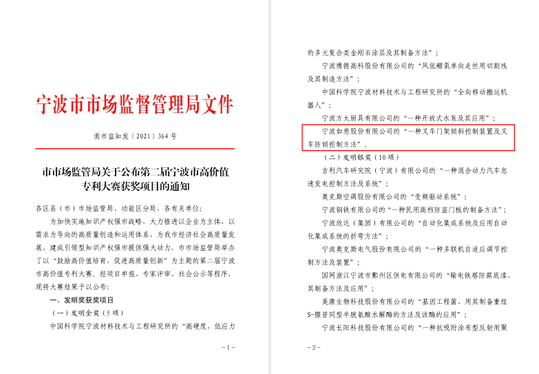 宁波如意发明专利项目:《一种叉车门架倾斜控制装置及叉车防倾控制方法》在宁波市高价值发明专利大赛中荣获“高价值发明专利金奖” 。