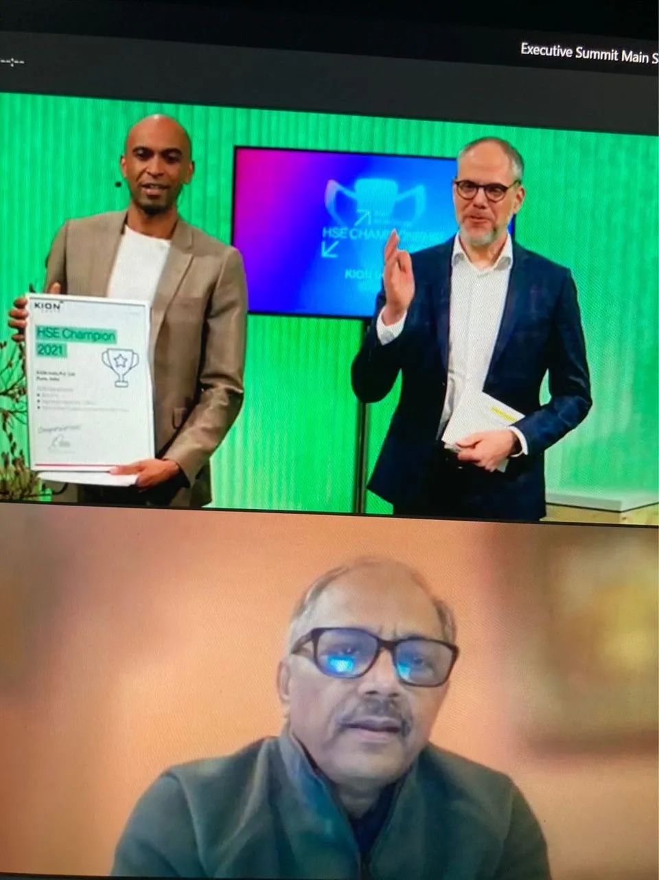 凯傲印度总裁Sunil Gupta(图片下方)代表凯傲印度工厂在线领取了全球安全冠军奖项