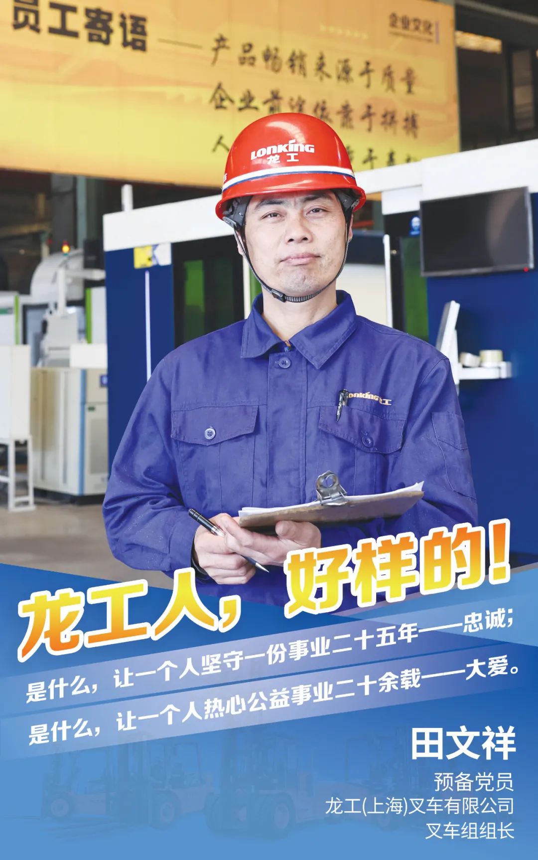 工作中的田文祥爱岗敬业。从学徒工到电焊师傅,从一线岗位到质检员,从售后服务员到项目生产组长,一路跟随龙工叉车的发展,一心践行事业有成的初衷!