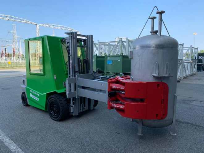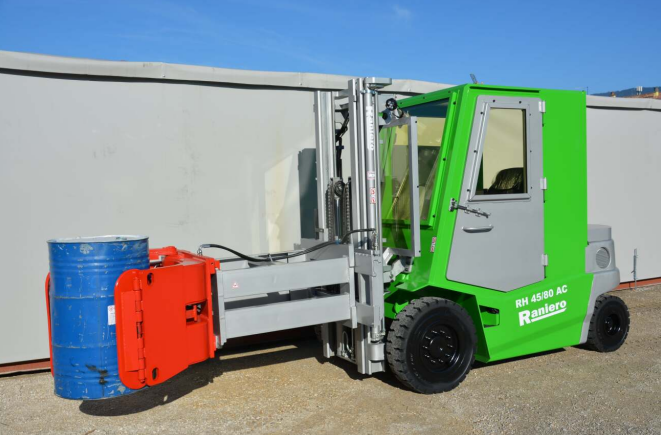搬运装有放射性废物的桶、箱和容器需要使用带有固定延伸臂的包夹。为了补偿任何振动和压力,Raniero为其加强了车轴,并用一个负载稳定器来固定门架。