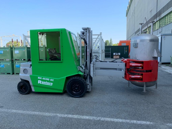 Sogin公司是一家负责意大利退役核电站和管理放射性废物的公共公司。自2012年以来,raniero和其的合作继续进行,交付了几台AC250-8 120V - 25000公斤的叉车,载荷重心为800毫米。最新的订单包括RH45配置--4500公斤,500毫米,用于搬运装有放射性废物的桶和容器。