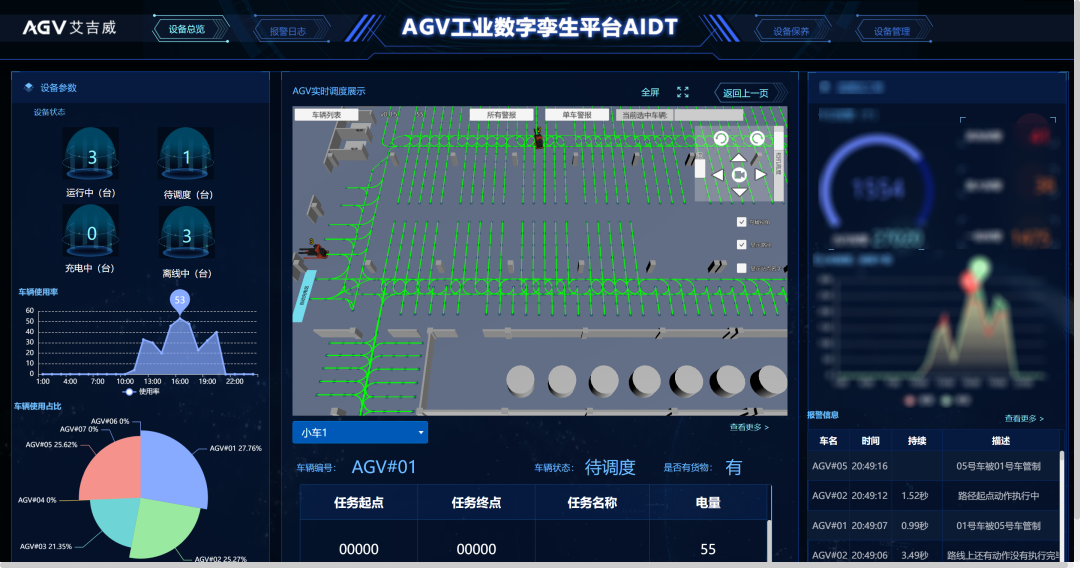 然而,小A的故事还没有结束。基于艾吉威免费赠送的数字化工厂AIDT(艾吉威工业数字孪生)平台,小A可以做一些维护保养的事项。该平台可采集每辆小千斤的所有信息,包括故障、速度、电量、任务等,可实现对所有机器人产品的实时监控与故障排查,真正实现小千斤产品的远程运维。
