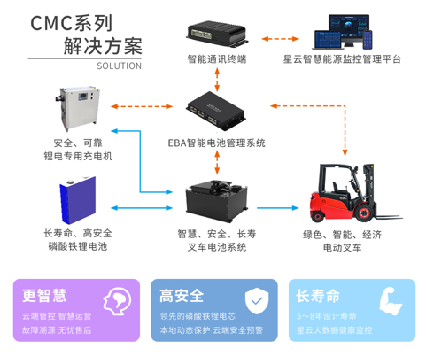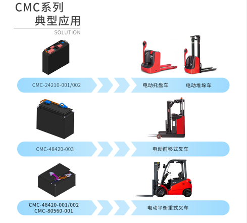 重庆云宸借助自主研发的“智慧、安全、长寿”的锂电能源终端、以及星云智慧能源监控管理平台,提出CMC系列叉车电池系统解决方案,可广泛应用于“新车配套”、“油车改电”、“铅酸替代”等应用场景。CMC系列电池产品适用于电动托盘 车、电动堆垛车、电动前移式叉车、电动平衡重式叉车等,同时可根据客户需求定制。