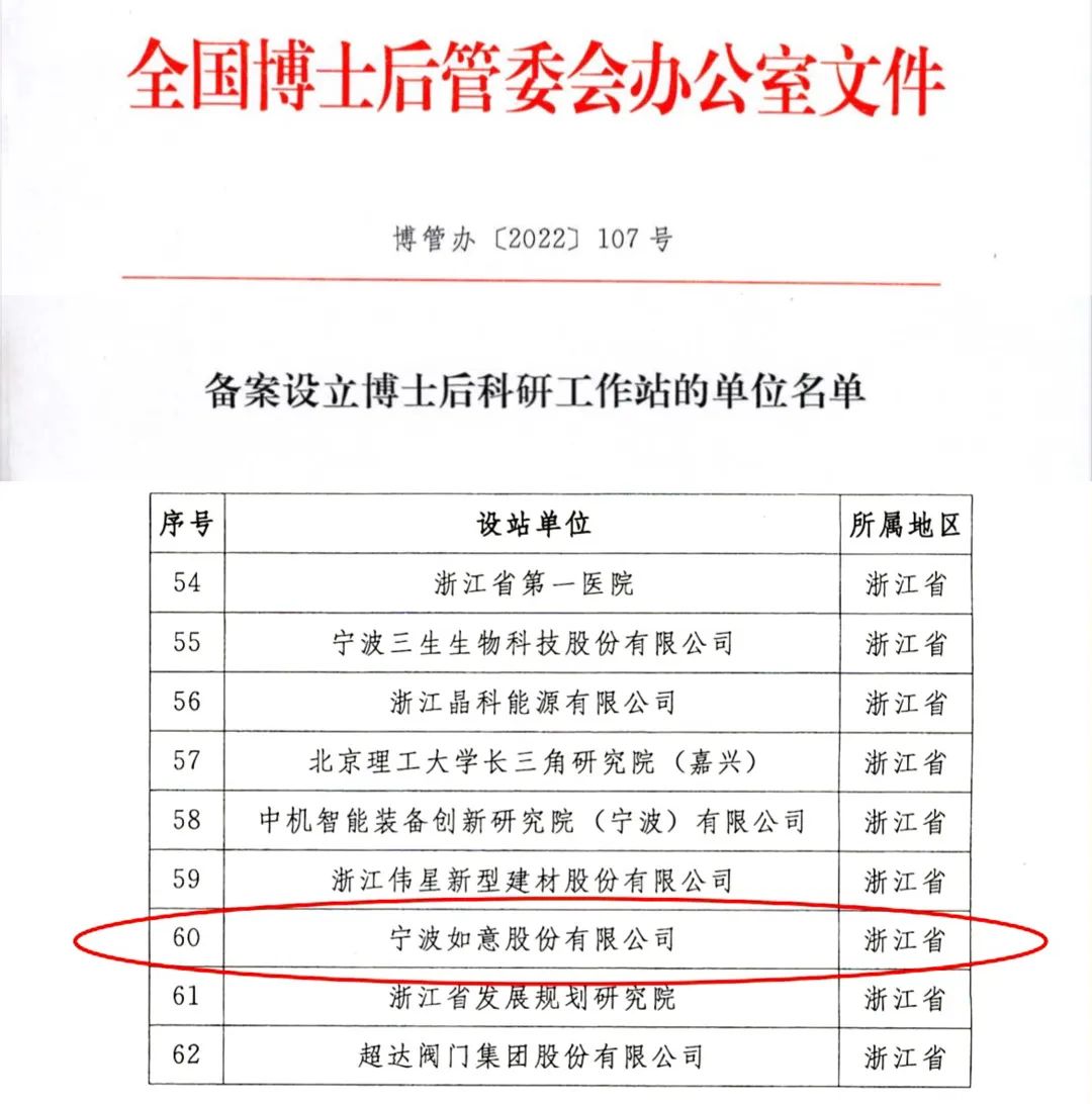 近日,人力资源社会保障部、全国博士后管委会联合发文公布了2022年第一批符合国家级新设站条件的企业名单,宁波如意成功获批。
