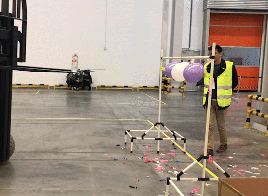 从指定起点出发,参赛选手先到水袋区域用货叉取气球水袋。(要注意不能让水袋掉落在地面哦~)