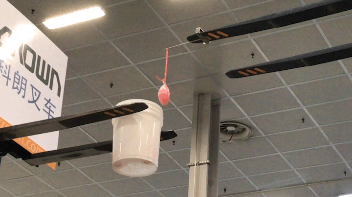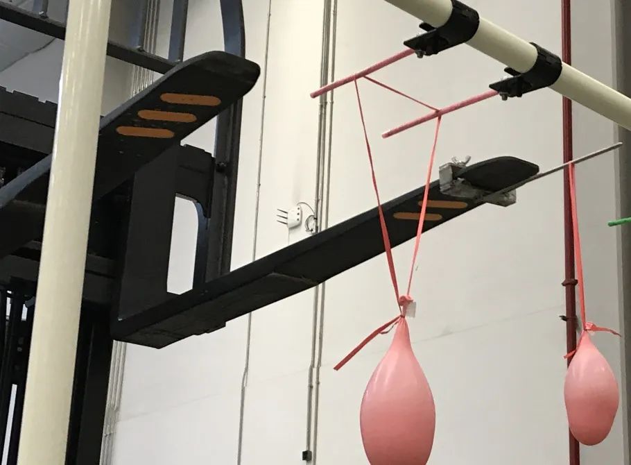 利用货叉尖上固定的钢针扎破所有绳索上的气球,期间,保证水杯不倒,难度系数将高达五颗星。