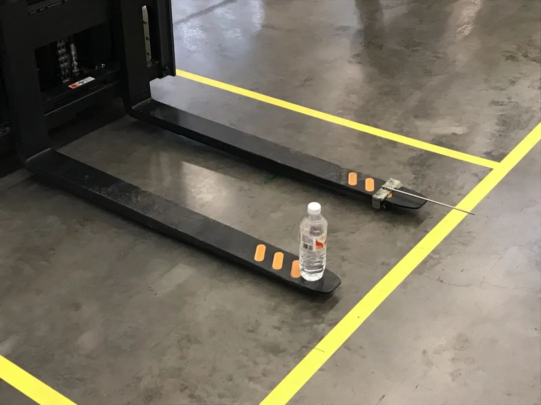 一根货叉前端绑定一根钢针,另一根货叉上摆放一个水杯/或水瓶(水杯蓄水)。