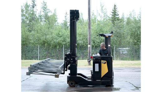 如图所示,Cat NRM25N2 多向前移式叉车用于处理狭窄通道中的超长负载。