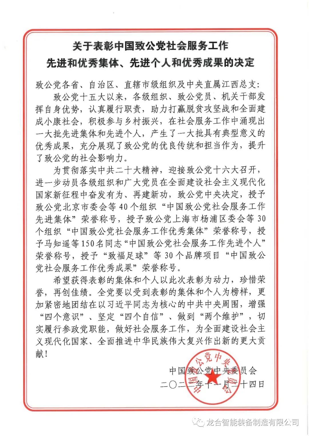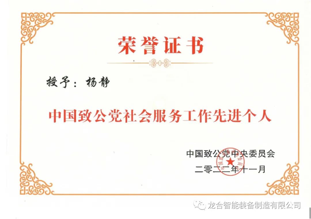 近日,中国致公党社会服务工作会议以线上线下结合方式在北京召开,会上总结了近五年全党社会服务工作并表彰先进集体及个人。龙合智能装备制造有限公司董事长杨静荣获“先进个人”奖。