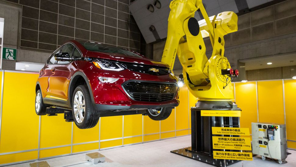在 2022 年东京国际机器人展览会上,发那科机器人移动车辆。