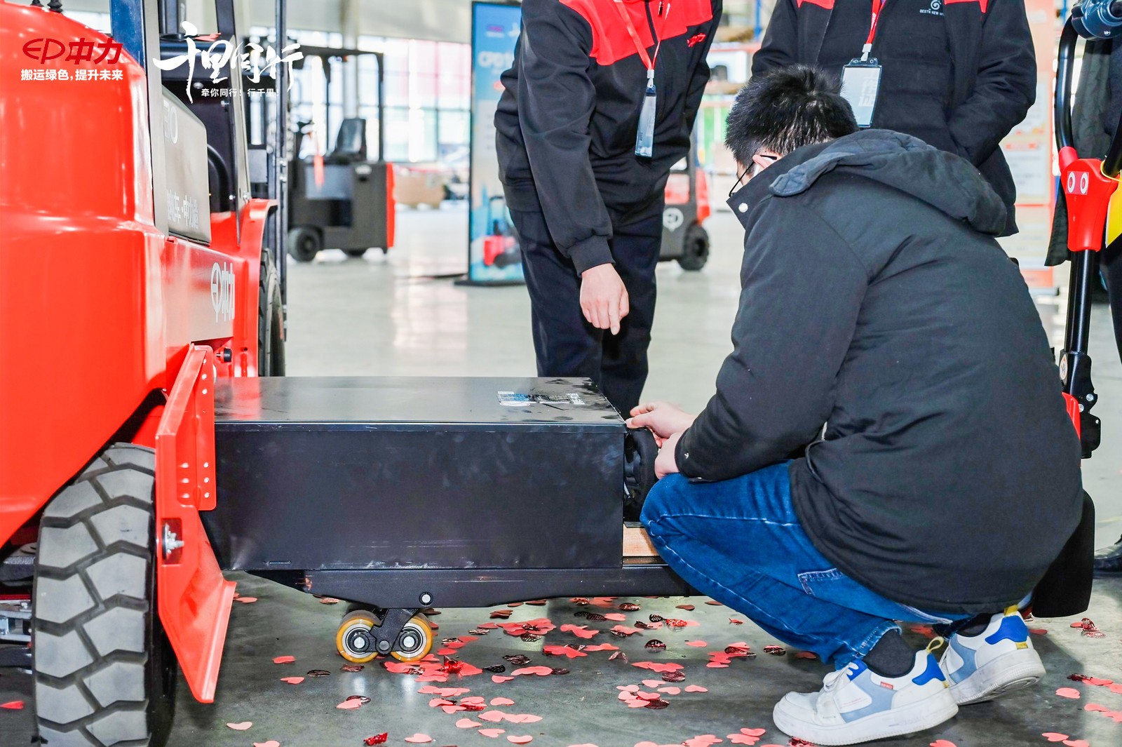 在此次狂欢盛典中,中力发布了一款3吨锂电叉车EFX302,这是中力在解决叉车的电动化之路的痛点长续航提出的新思路,通过快速换电来很好的规避锂电叉车不能高强度的长时间工作。该解决方案也是中力首创,值得关注的是换电方案不仅简单快速,而且一个女生也能轻松操作,电池也有多种Ah可选。