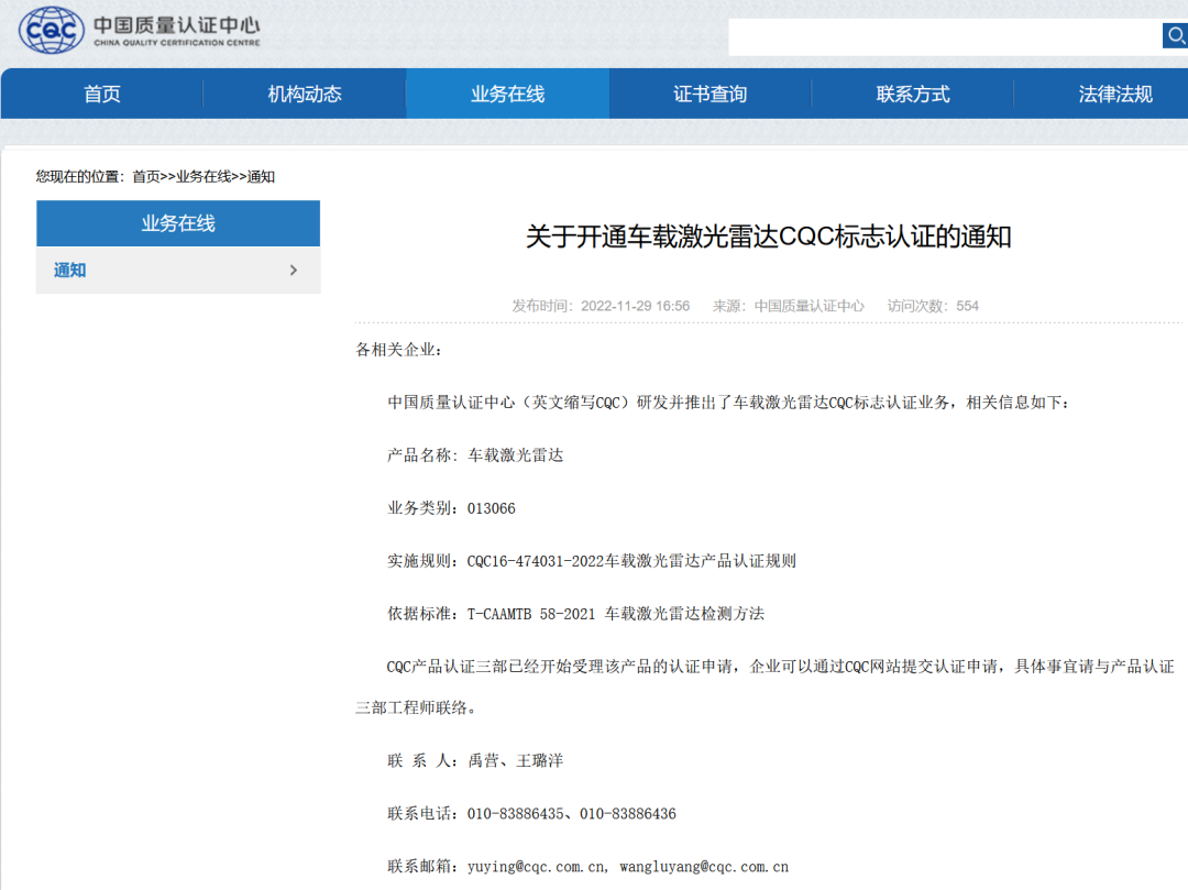 中国质量认证中心公布《车载激光雷达CQC标志认证》