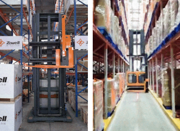 现场,卓一智能叉车以视频形式向客户展示了窄巷道高位堆垛技术在各行业的应用案例。