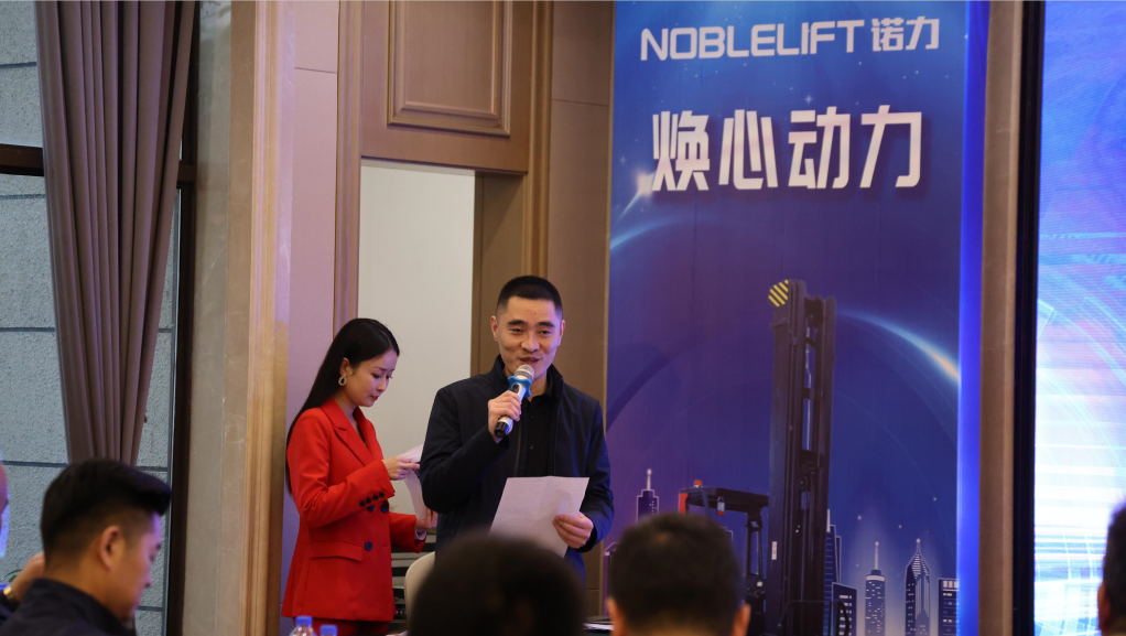 诺力智能装备股份有限公司副总经理刘宏俊致开幕词。他首先代表公司对各代理商在过去的一年里所取得的成绩及对公司做出的贡献表示肯定与感谢。然后给大家解读,叉车行业发展现状和趋势。