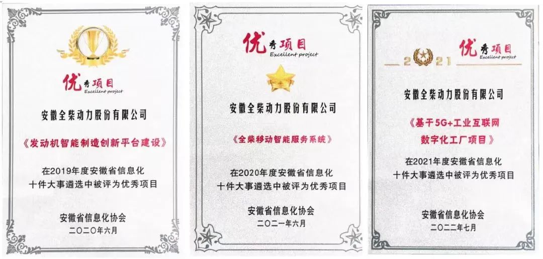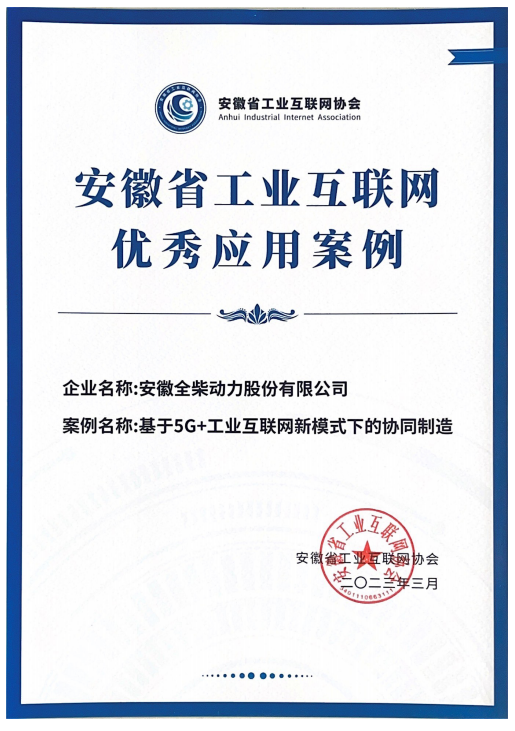 全柴“基于5G+工业互联网新模式下的协同制造”,荣获安徽省工业互联网优秀应用案例。