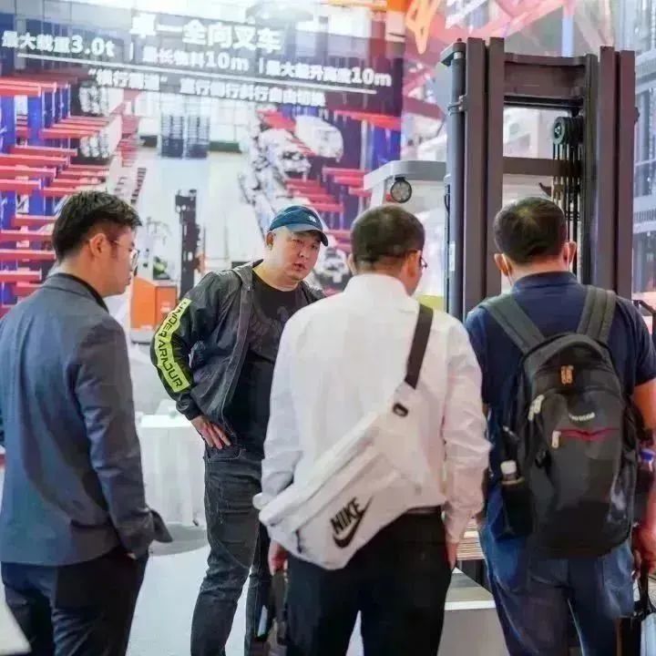 卓一智能叉车所在的4A51展台,大屏轮播着全向叉车的经典案例,吸引了众多客户前来参观洽谈。
