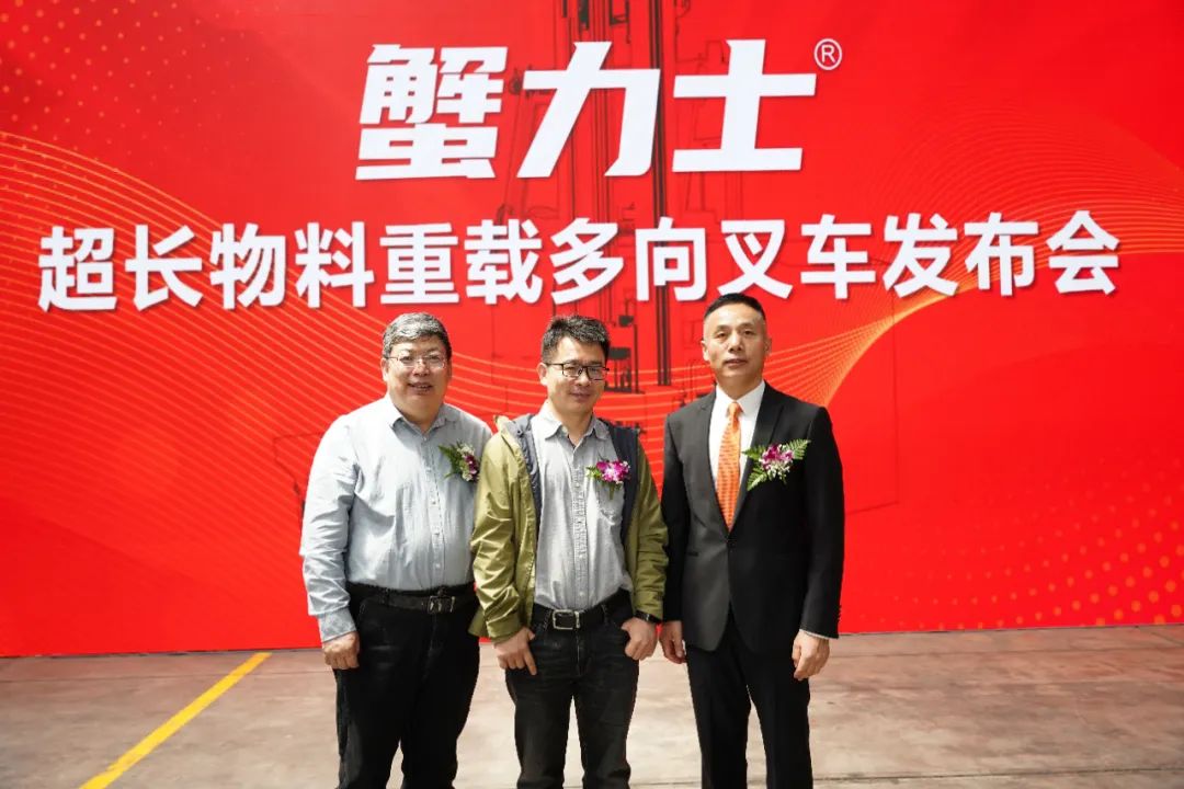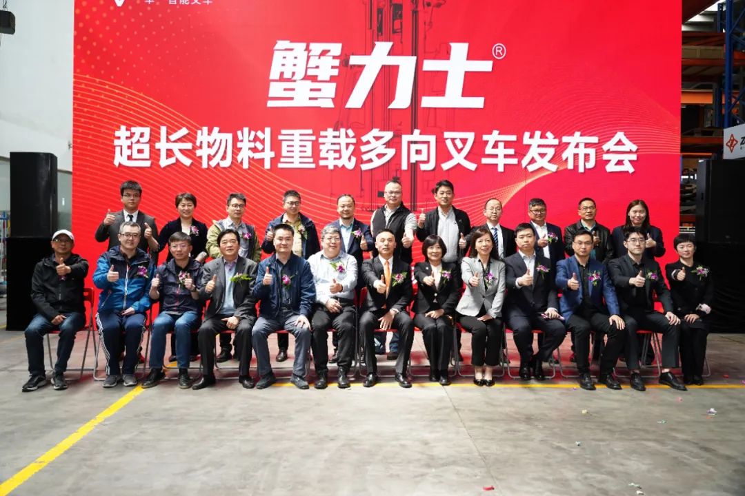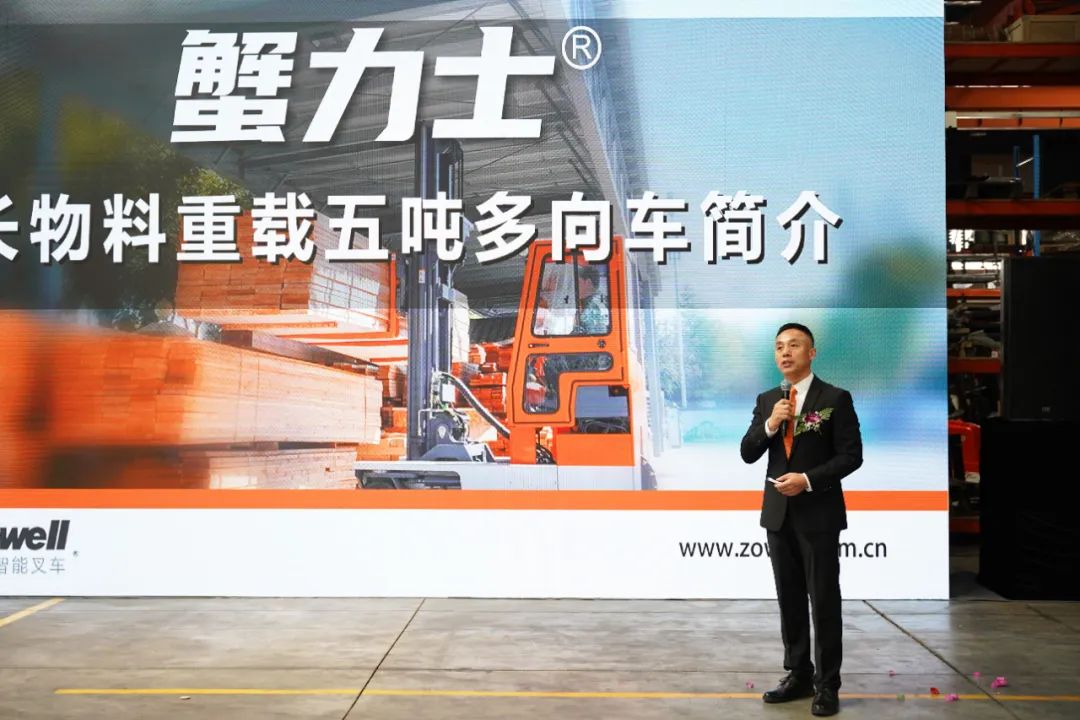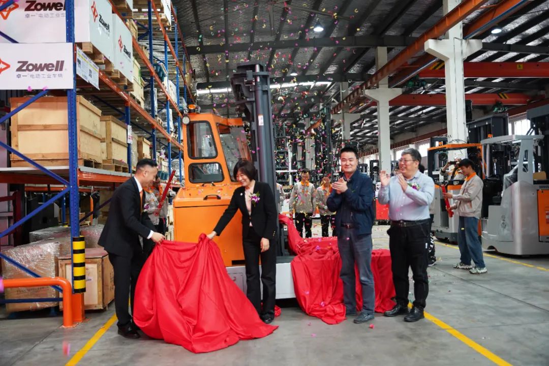 在卓一智能叉车潘总和三名与会嘉宾代表的共同揭幕下,卓一“蟹力士”多向叉车正式亮相,宣告着这款超长物料重载多向叉车在物流领域开启全新征程。