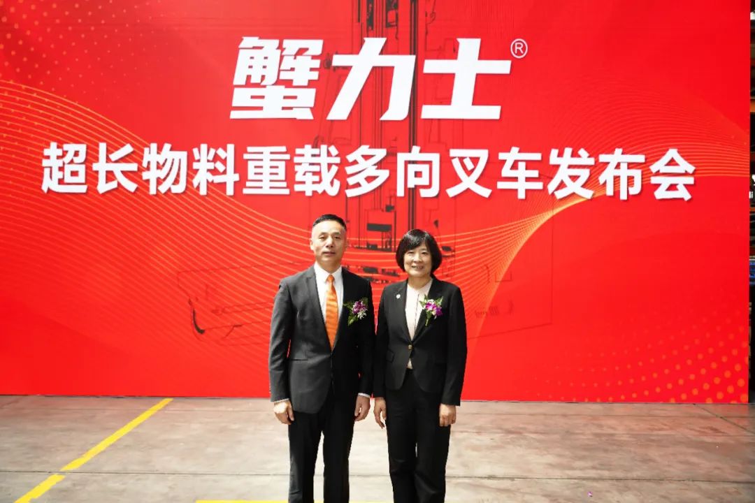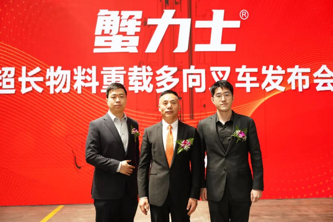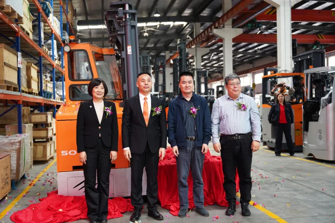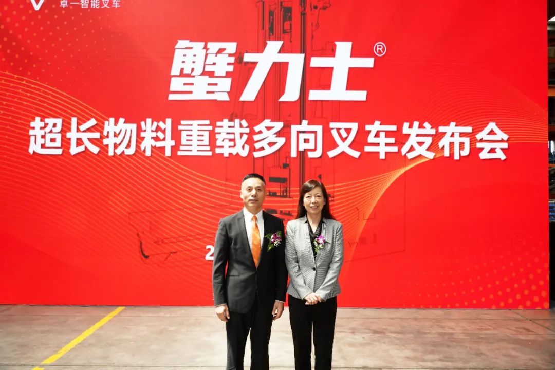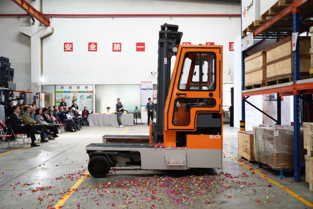 在卓一智能叉车潘总和三名与会嘉宾代表的共同揭幕下,卓一“蟹力士”多向叉车正式亮相,宣告着这款超长物料重载多向叉车在物流领域开启全新征程。