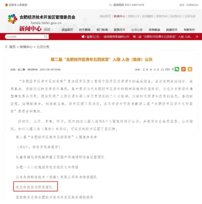 近日,优旦科技技术研发团队入围第二届“合肥经开区青年五四奖章”集体名单,这是对优旦科技技术研发团队取得科技成果的肯定,也是对优旦科技持续推动科技创新之路的激励。