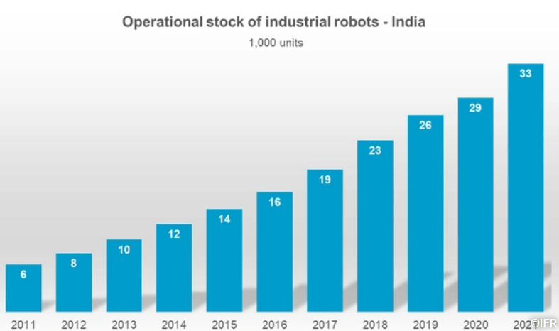 "印度是世界上发展最快的工业国家之一。"国际机器人联合会主席Marina Bill说。"在五年内,工业机器人的运行库存增加了一倍多,在2021年达到了33220台的总量。自2016年以来,这代表了16%的年平均增长率"。