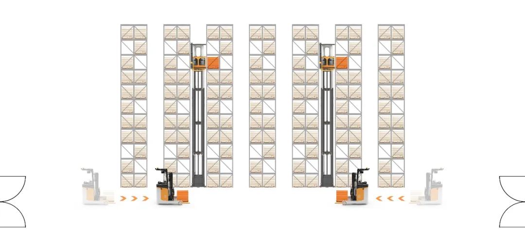 人上行标配的三向电动叉头,仅需不到10s即可完成货叉180°旋转,在1.6m的巷道内轻松换向叉取通道两侧货物,极大程度提升物资周转效率;
