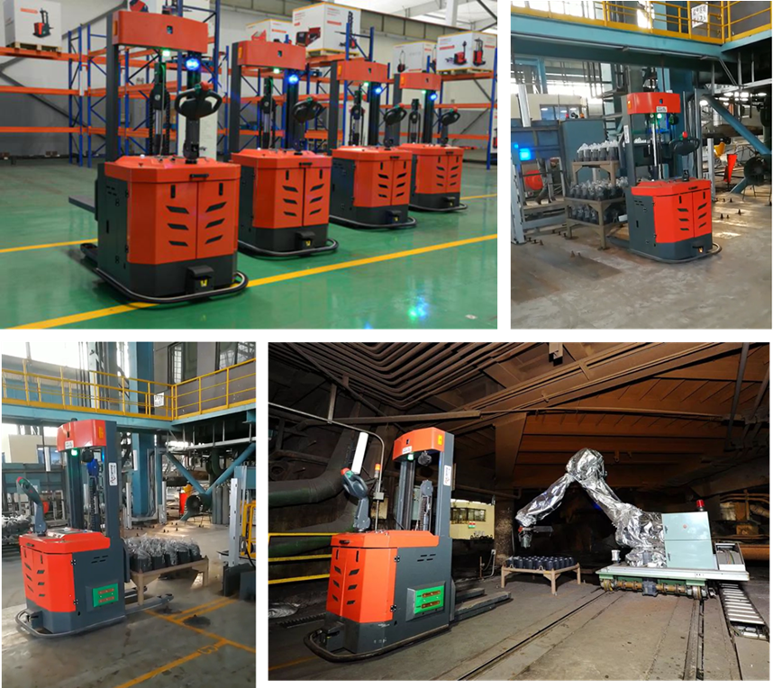 项目配置:4台装载有科尔摩根NDC8系统的诺力PS20L AGV、4套6轴工业机器人、2套WMS炮泥框库位管理系统