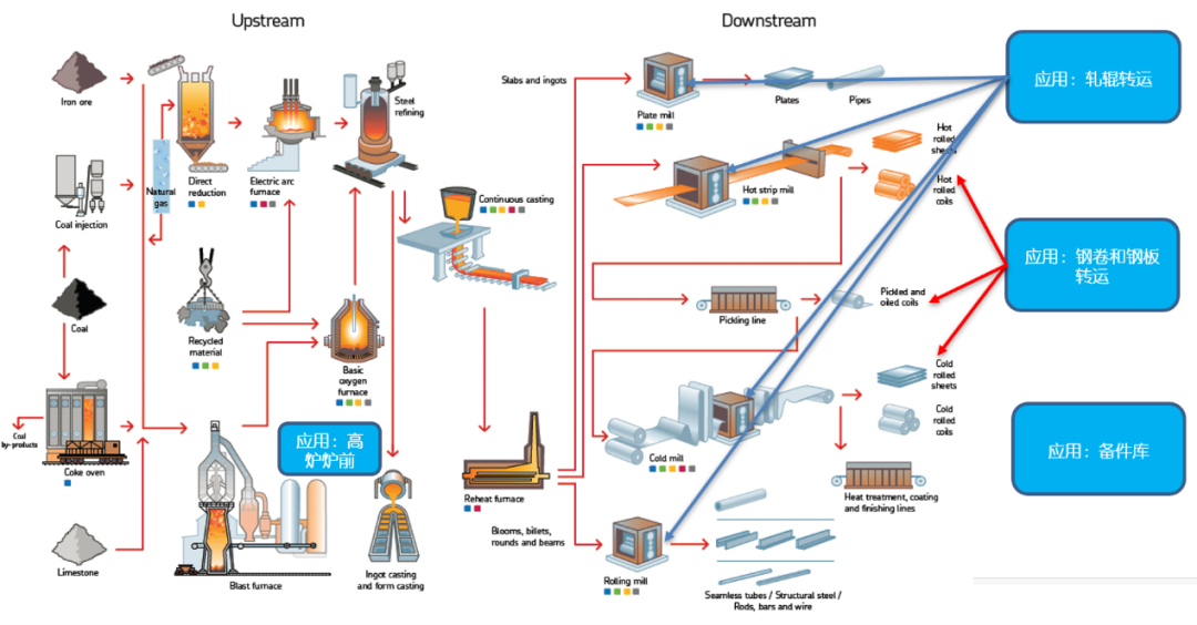 在上游工序中,铁矿石,焦炭等生产主辅料的运输,是采取输送机运输;从高炉炼铁到转炉炼钢,是采取轨道车辆运输;炼钢和连铸通常为同车间前后工序。连铸机生产出的板坯和方坯等,是上游工序的最终产品,也是下游工序的原材料,是采用有人驾驶的重型车辆运输到下游工序。使用薄板坯连铸连轧工艺的流水线,则是连铸机铸造出的板坯直接进入连轧工艺(下游工序)。