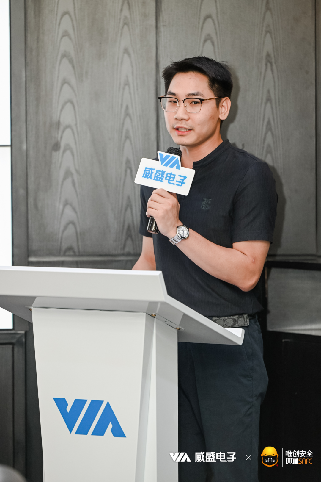 威盛电子中国区销售总监谢東成对所有参会嘉宾表示热烈欢迎。他详细介绍了威盛电子的车载安全技术,并强调其在乘用车、工业车辆和工程机械安全驾驶领域的广泛应用。特别指出威盛电子是全球首家将人工智能(AI)引入此领域的公司,这一创新举措得到了业界广泛认可。在过去多年里,威盛电子不断积累技术,一直致力于推动车载安全技术的发展。他还分享了威盛电子的发展历程、在行业中的影响力以及当前的研发状况。