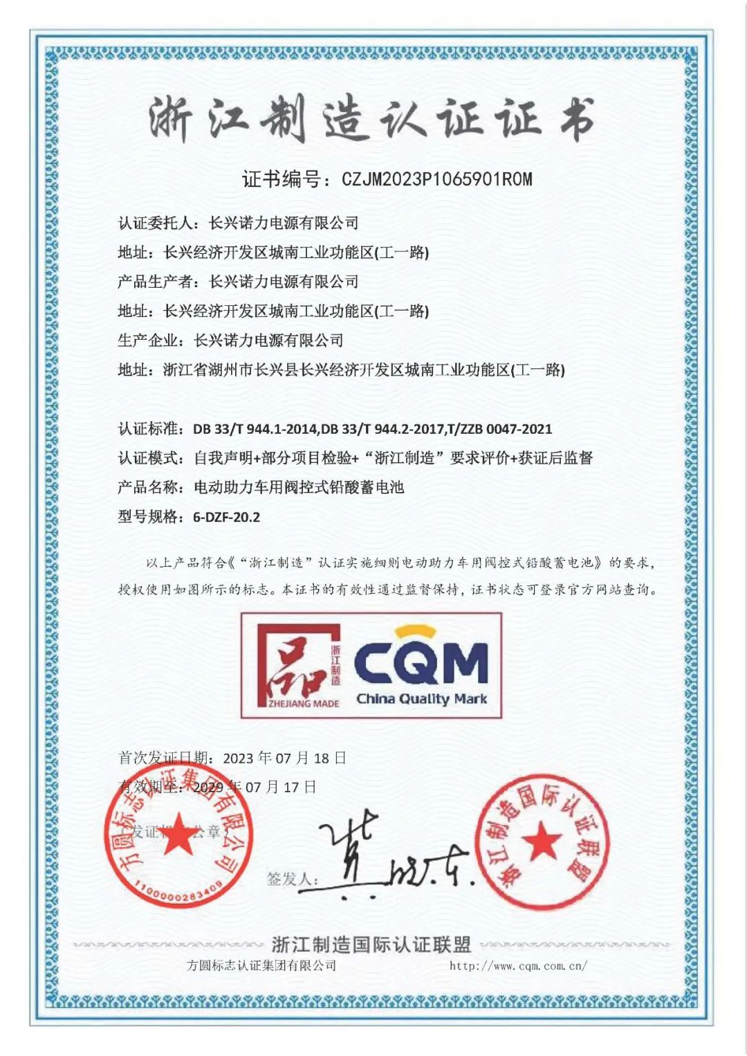 2023年7月18日,在经过严格的产品检验、第三方审查等环节,诺力电源正式获得《浙江制造认证证书》,此证书是由浙江制造国际认证联盟和方圆标志认证集团有限公司(CQM)联合签发,这也意味着《电动助力车用阀控铅酸蓄电池6-DZF-20.2)》成功通过了浙江制造业含金量最高的标准认证,获得了“品字标”。