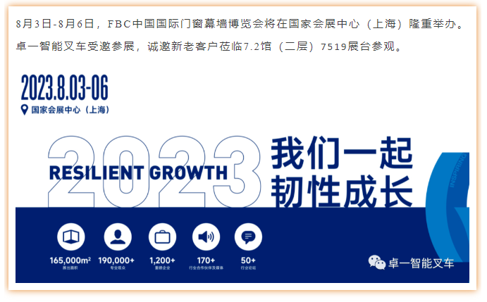 展会预告|卓一携窄巷道叉车亮相中国国际门窗幕墙博览会