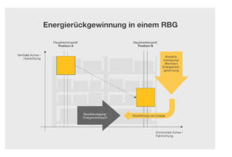 德马泰克产品经理 Uwe Schatz 解释了德马泰克堆垛机的工作原理:"每台堆垛机都在水平和垂直两个轴上运动,每个轴都有一个电机。当升降小车向下移动时,会主动制动,因为它是逆重力工作的。此时,我们可以将垂直轴上的电机用作发电机,回收能量。"