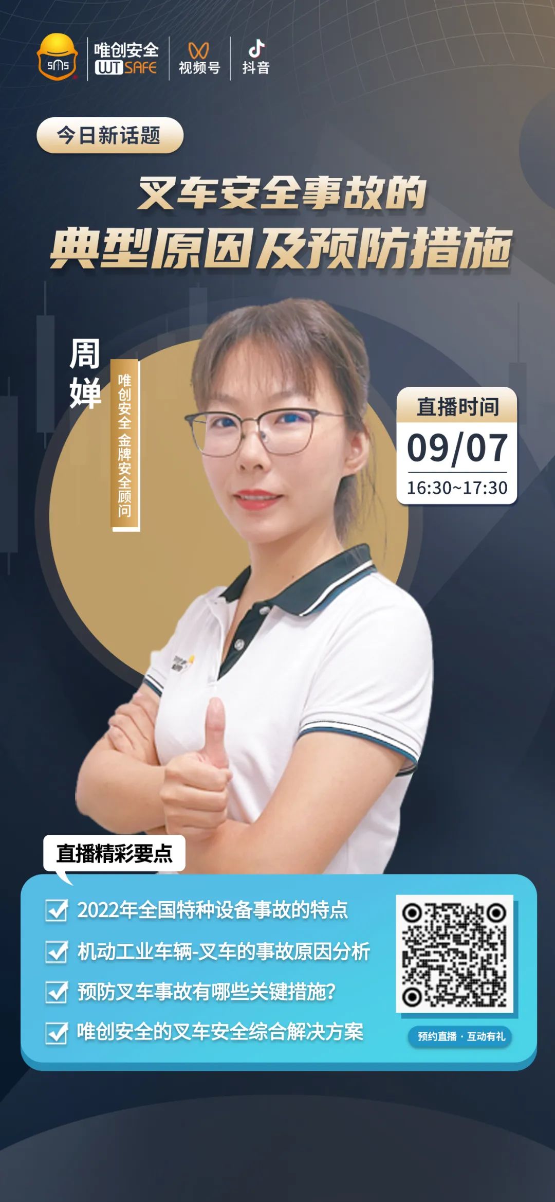 造成叉车事故原因这么多,我们该采取哪些预防措施呢?本周四下午4点半,唯创安全直播间准时开播,由金牌安全顾问-周婵为我们带来相关分享。
