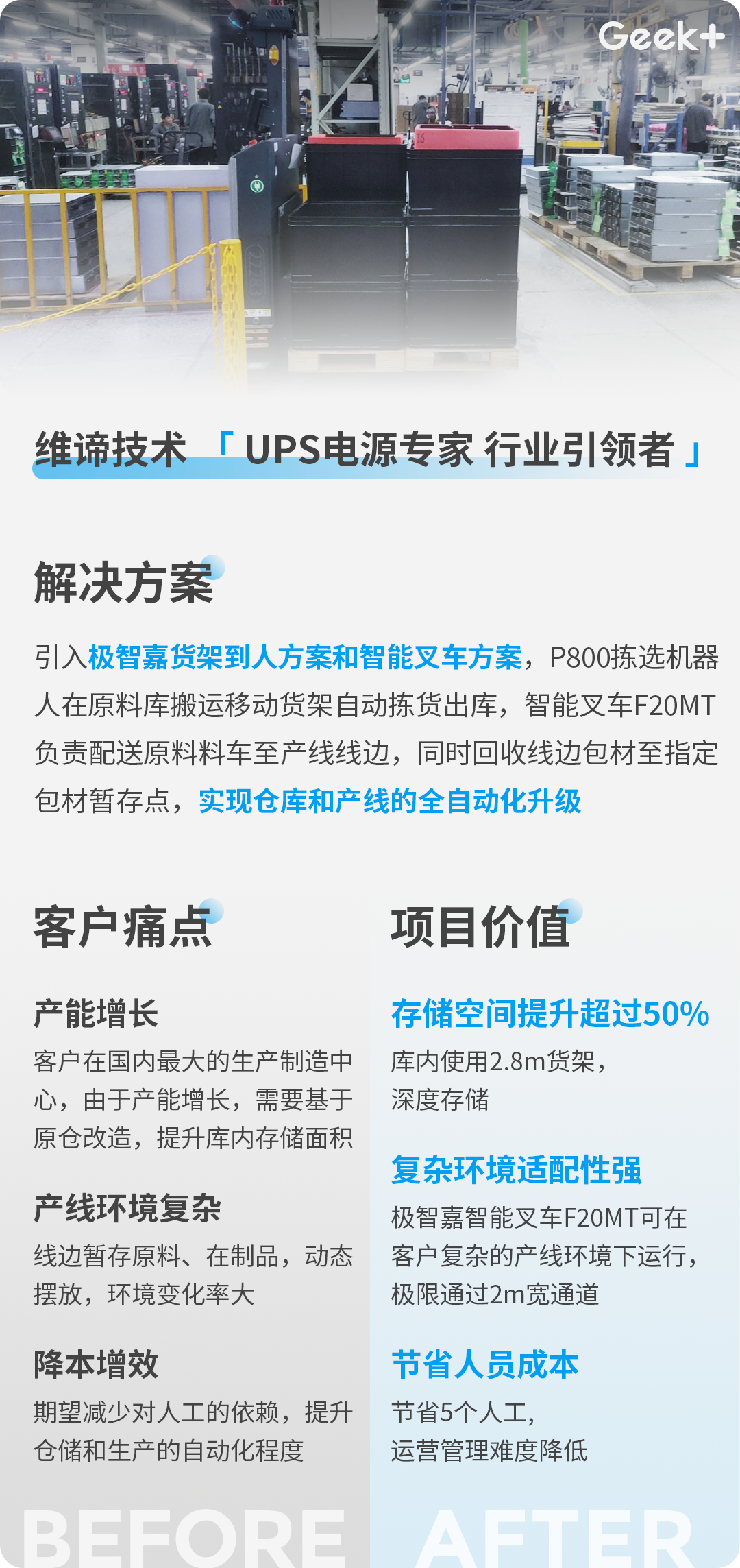 目前,极智嘉F20MT智能叉车已服务于例如维谛技术等众多锂电、汽车、电子制造、仓储物流行业客户。F20MT如何能够纵横产线与仓储场景中,为客户切实带来降本增效的价值?本文将为你一一解读。