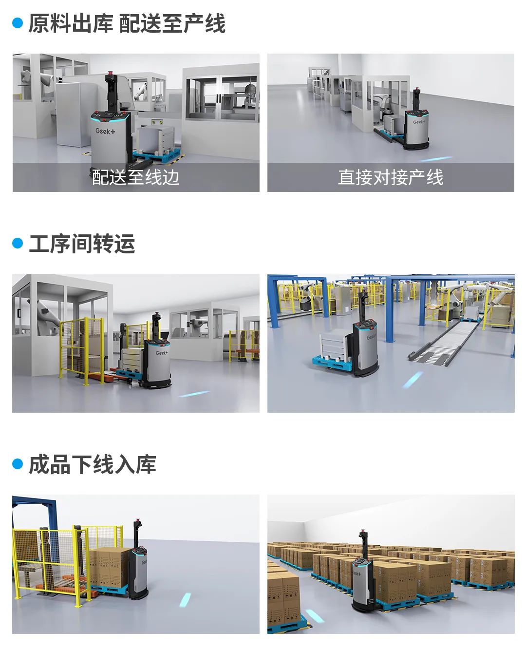 在制造业工厂场景中,智能叉车改变着传统的配送习惯。极智嘉智能叉车根据上游系统订单自动将原材料从仓库配送至生产线,并实现工序之间的物料转运,成品下线后自动配送至成品仓库。