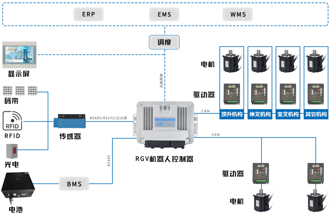 ①强劲核心,整车只需一个控制单元专用控制器,工业级高标准品质,内置行业专用算法,不单单是逻辑判断。可实现高平稳运行、高精度定位。自带I/O资源,拥有各类接口,整车控制只需一个专用控制器,更省空间,更省开发时间。②标配二次开发平台,适用任何车型标配专用二次开发平台,外设接入友好。执行机构自主开发,无论是料箱式、托盘式或者是其他形态。