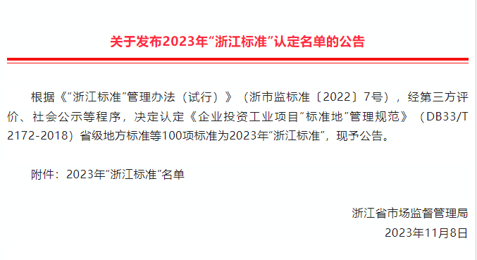 “浙江标准”每两年评定一次,每次评定名额不超过100个。2023年是浙江省首次组织“浙江标准”评价工作,能够体现技术创新元素、符合高质量发展需求、具有共同富裕特征的高质量高效益的先进标准,可被评定为“浙江标准”。