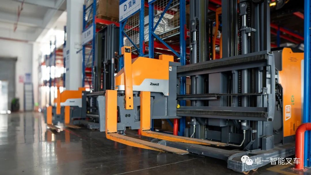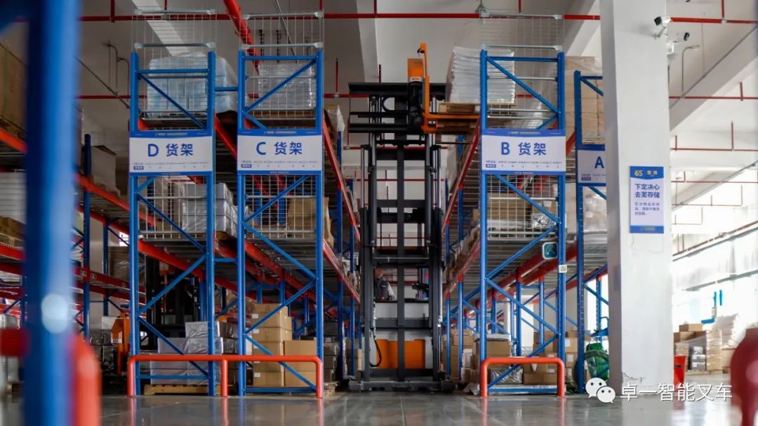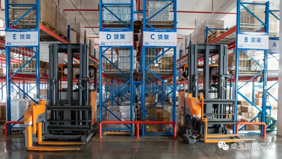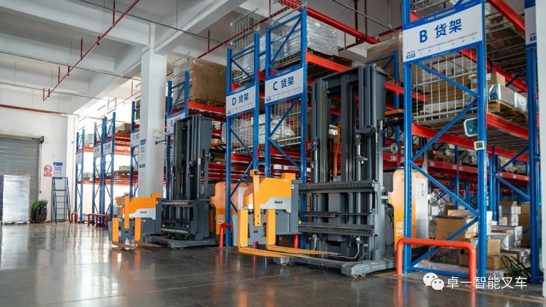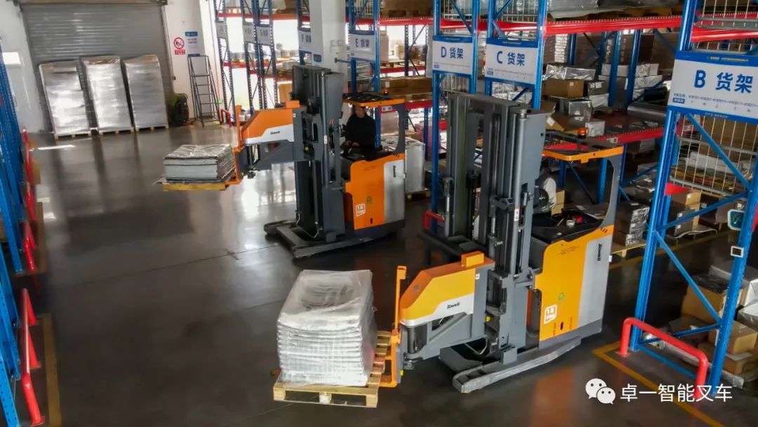 近日,卓一智能叉车两台人下行三向叉车在国内某新材料包装企业成功落地运行。