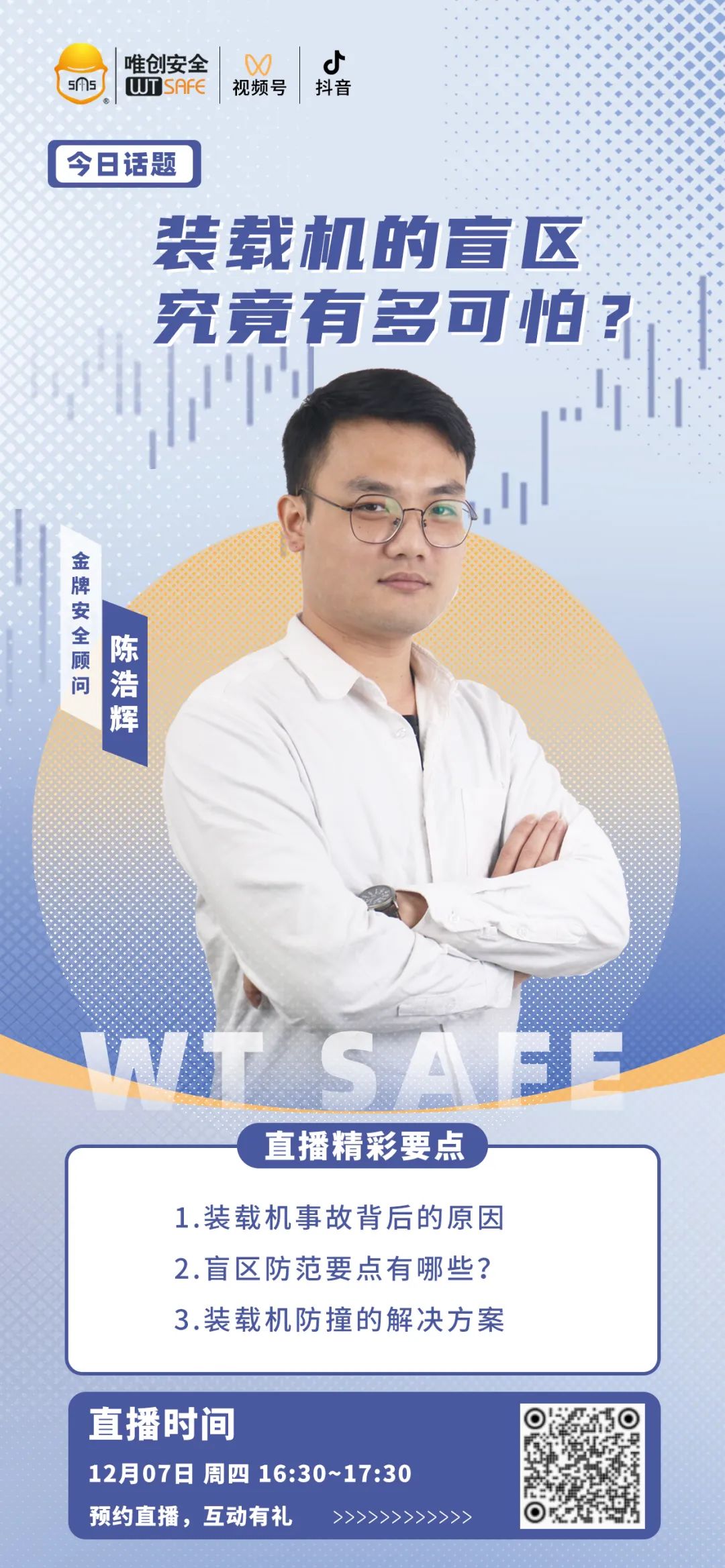 具体有哪些解决方案呢?本周四下午4点半,唯创安全直播间准时开播,由金牌安全顾问-陈浩辉为我们分析装载机事故背的原因,及盲区防范的要点,并提供多种装载机防撞的解决方案: