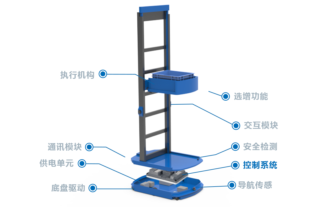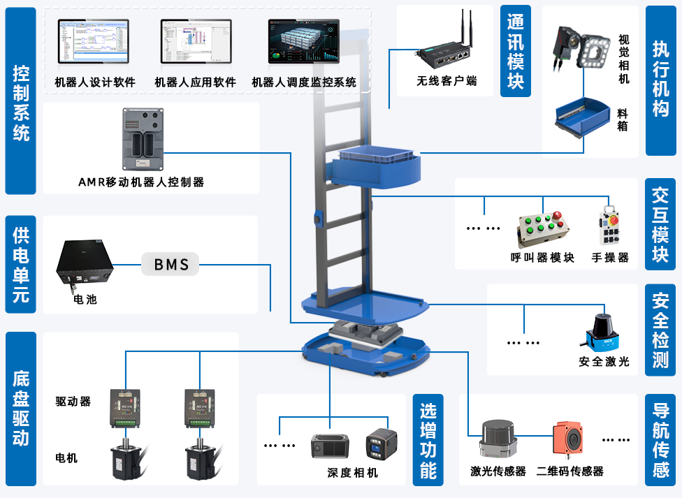 料箱式移动机器人整体解决方案,根据移动机器人的整机功能,主要分为控制系统、导航传感、底盘驱动、执行机构、安全检测、交互模块、通讯模块、供电单元、选增功能等九大单元模块构成。