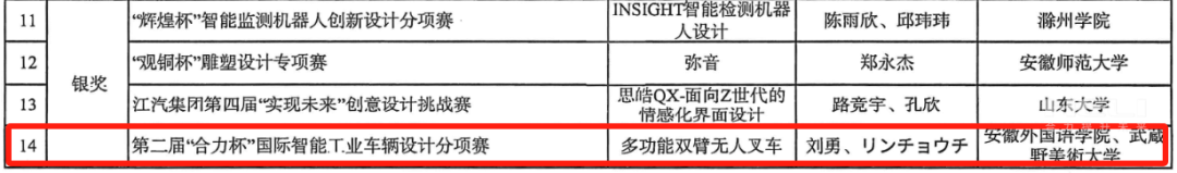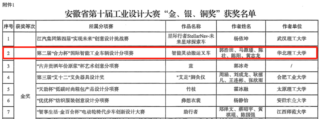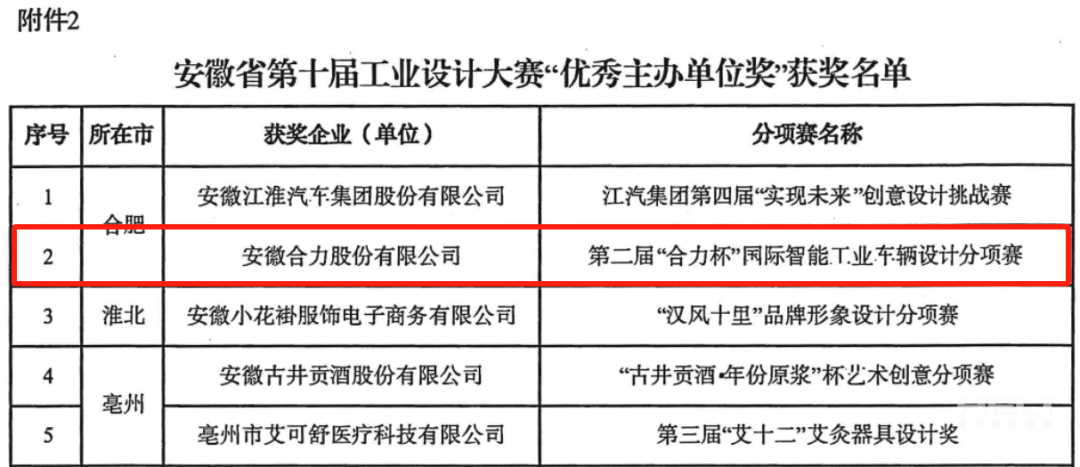 近日,安徽省经济和信息化厅公布了安徽省第十届工业设计大赛“金、银、铜奖”和“优秀主办单位奖”获奖名单。其中,安徽合力股份有限公司作为第二届“合力杯”国际智能工业车辆工业设计分项赛的主办单位,荣获“优秀主办单位奖”。分项赛推荐的作品《智能灵动搬运叉车》荣获安徽省第十届工业设计大赛金奖,《多功能双臂无人叉车》荣获安徽省第十届工业设计大赛银奖。