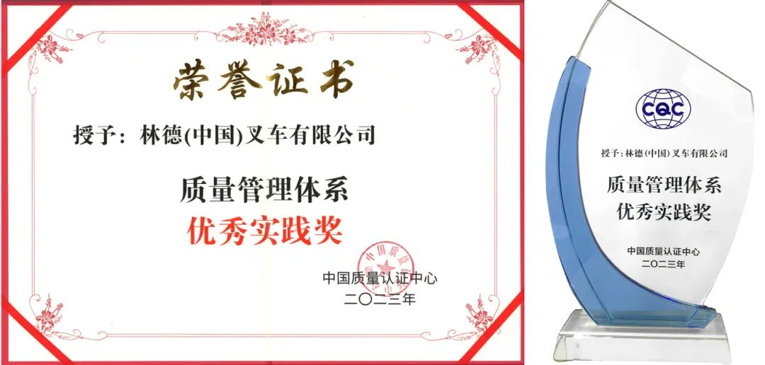 中国质量认证中心于2023年组织了全国范围内首届“质量管理体系优秀实践奖“的评选,经过激烈的竞争,行业专家的评审,林德(中国)叉车有限公司从3万多家单位中脱颖而出,荣获的“2023年度质量管理体系优秀实践奖”称号。目前,全国仅20家企业获此殊荣,这一荣誉是对林德(中国)一贯卓越的质量管理、强大的制造体系和出众的产品品质的高度肯定。