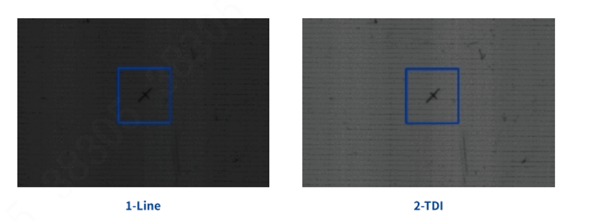 在相同环境基础上提高图像亮度,增强缺陷对比度,有助于缺陷检测。如下是我们在光伏行业针对电池片检测过程中的图像对比效果,2-TDI模式相对于1-Line模式缺陷对比度更高。