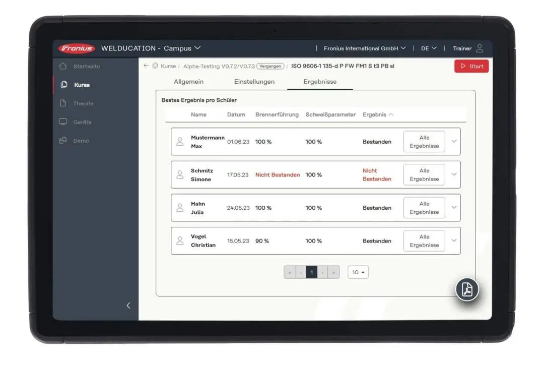虚拟焊机通过Welducation Campus平台提供理论和实践培训单元相结合的完整教学系统。学员可以通过相关课程快速自学,多种焊接分析选项可以让他们不断跟踪自己的学习进度。培训师不仅可以在Campus平台创建自己的课程,也可以在上面了解学员的表现,查看他们在虚拟实操中的焊接练习次数和完成情况。
